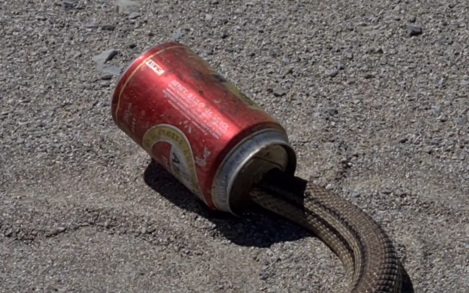 Snimak prikazuje zmiju koja je na plaži u Lefkadi uvukla glavu u limenku piva i više nije mogla da je izvuče.