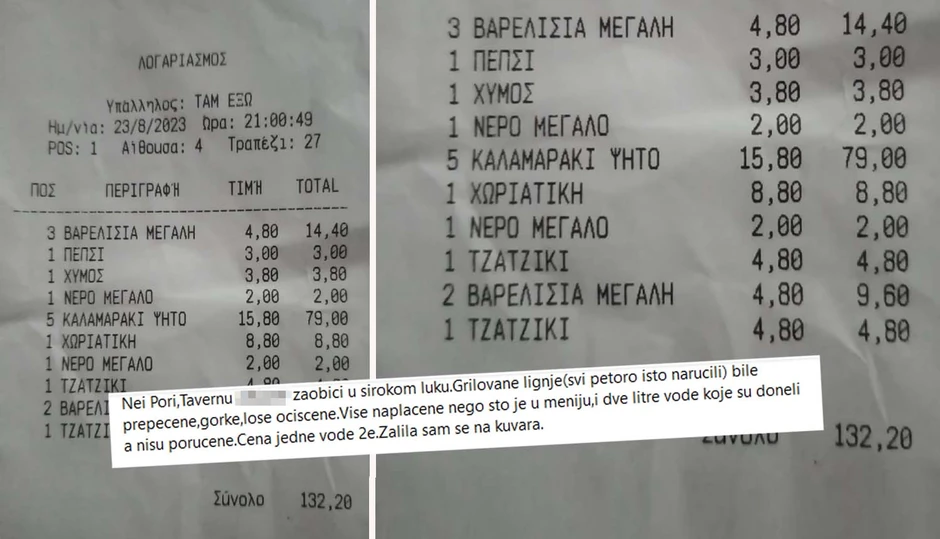 Tako je bilo i ovog puta, kada je na Fejsbuk grupi "Live from Greece", Irena objavila fotografiju računa iz jednog restorana u Grčkoj, žaleći se na kvalitet ali i cenu hrane i pića, koja nije odgovarala onim cenama koje su se nalazile u meniju.
