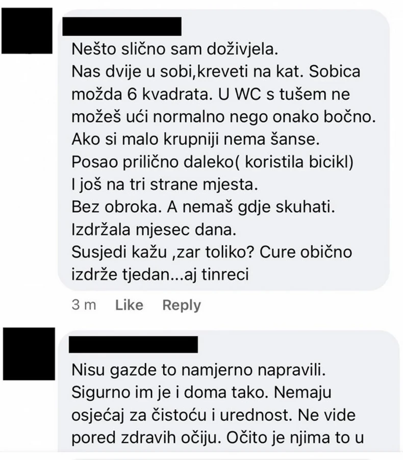 Još jedna devojka je podelila svoje iskustvo, koje je slično prethodnim. Ona kaže da su čak neki bili smešteni i u kamp prikolicama, a da je u smeštaju bilo i miševa.