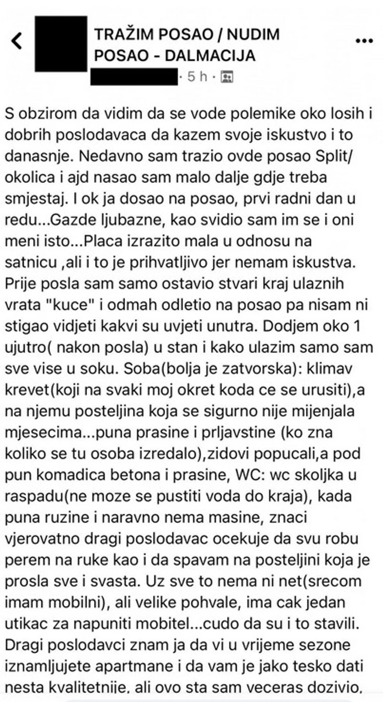 Svoje iskustvo podelio je na FB stranici "Tražim posao/nudim posao - Dalmacija".