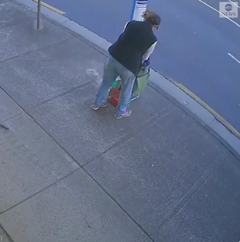 Na snimku se vidi kako zatvara flašu i stavlja je u torbu koju je ostavila na trotoaru bliže putu, pored još jedne torbe. Za nekoliko sekundi se okreće i odlazi, a u pravu njenih stvari proleće vozač koji je izgubio kontrolu, tačno na mestu na kojem je ona do malopre stajala.