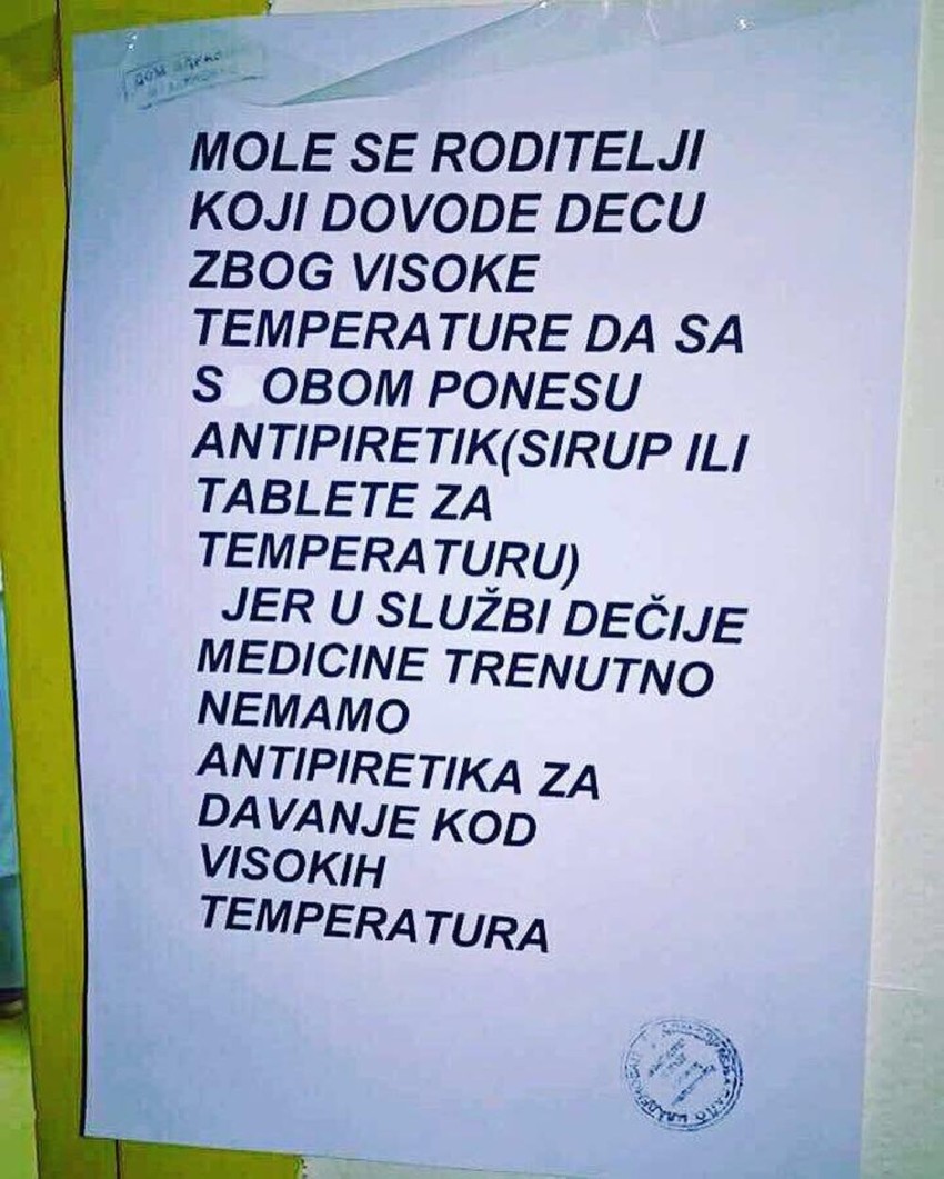 - Mole se roditelji koji dovode decu zbog visoke temperature da sa sobom ponesu antipiretik (sirup ili tablete za temperaturu) jer u službi dečje medicine trenutno nemamo antipiretika za davanje kod visokih temperatura.
