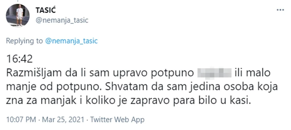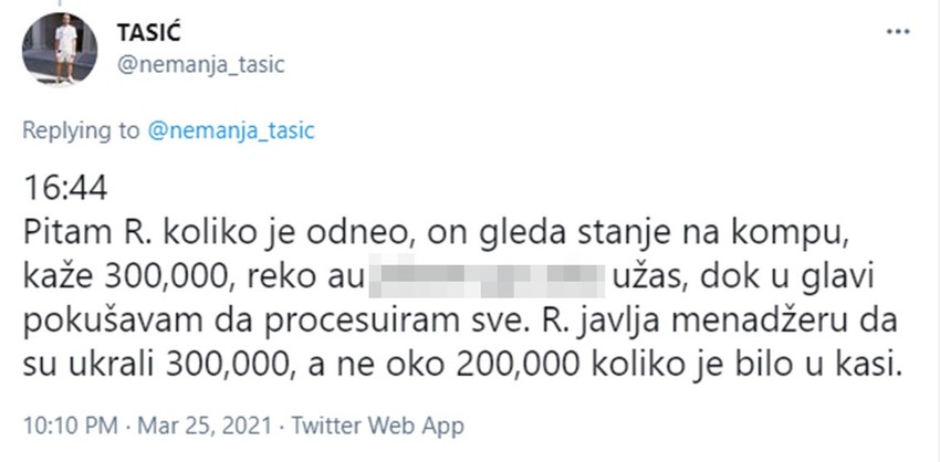Pitam R. koliko je odneo, on gleda stanje na kompu, kaže 300,000, reko au je*em ga usta užas, dok u glavi pokušavam da procesuiram sve. R. javlja menadžeru da su ukrali 300,000, a ne oko 200,000 koliko je bilo u kasi.