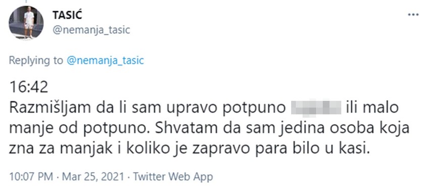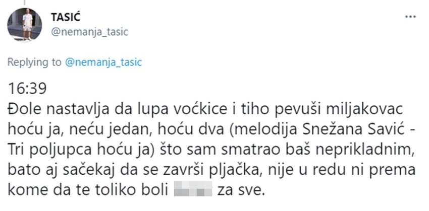 Nemanja Tasić, tviteraš i scenarista iz Beograda, podelio je na društvenoj mreži Tviter priču, zbog koje su se mnogi držali za stomak od smeha. Da li je ona plod njegovog bogatog smisla i talenta za humor, ili ju je život zaista režirao, ne znamo, ali jedno je sigurno, nasmejaće vas do suza, pošto je kompleksnija čak i od radnje u filmovima Kventina Tarantina.