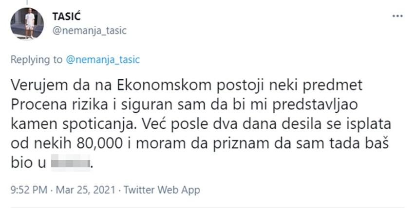 Verujem da na Ekonomskom postoji neki predmet Procena rizika i siguran sam da bi mi predstavljao kamen spoticanja. Već posle dva dana desila se isplata od nekih 80.000 i moram da priznam da sam tada baš bio u ku*cu.