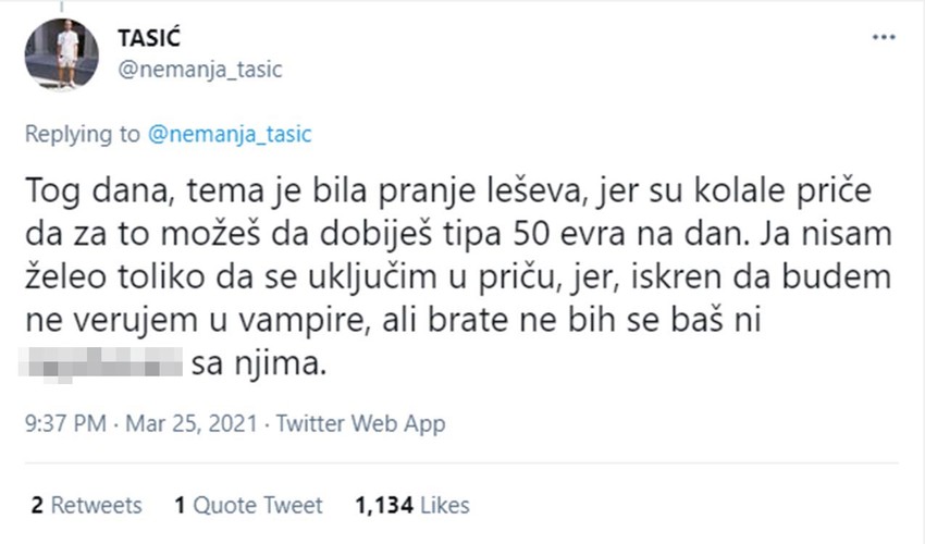 Tog dana, tema je bila pranje leševa, jer su kolale priče da za to možeš da dobiješ tipa 50 evra na dan. Ja nisam želeo toliko da se uključim u priču, jer, iskren da budem ne verujem u vampire, ali brate ne bih se baš ni za*ebavao sa njima.
