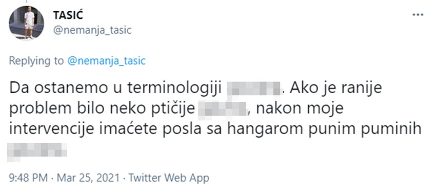 Da ostanemo u terminologiji gova*a. Ako je ranije problem bilo neko ptičije gov*o, nakon moje intervencije imaćete posla sa hangarom punim puminih gova*a.