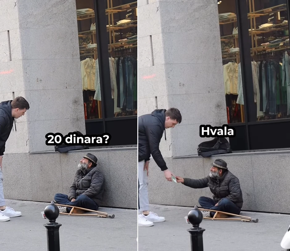 Naime, Čoda je objavio video snimak na svom Instagram profilu u kojem prilazi prosjaku u Ulici Kralja Petra u centru Beograda, a ono što je usledilo rasplakalo je najpre prosjaka, ali i mnoge ljude koji su imali prilike da pogledaju video.