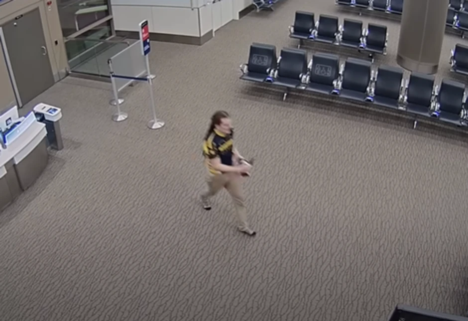 Nadzorni snimci objavljeni na Jutjub kanalu "FOX 13 News Utah" snimile su momka kako kroz aerodrom trči u čarapama, dok u rukama drži cipele i zaleće se na zaključana vrata gejta koja pokušava da otvor. Onda razgovara sa radnikom aerodroma, pre nego što se zatrčava na druga zaključana vrata kako bi ih razvalio. Tu pada na zemlju, ustaje i počinje da udara u staklo cipelama. Nakon toga ga kamere snimaju kako izlazi na vrata za evakuaciju i trči niz stepenice.