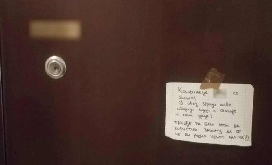 "Komšinice, j*bi se malo tiše! U ovoj zgradi žive stariji ljudi, a takođe i mala deca! Takođe bi bilo lepo da koristite zaštitu da se ne bi rodio idiot kao ti" stajalo je u neumesnom poruci besnog stanara jedne zgrade u Srbiji.
