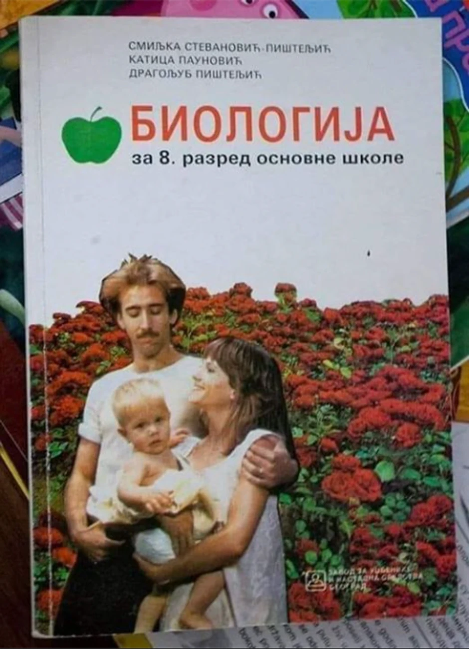Društvenim mrežama ovih dana kruži fotografija udžbenika biologije za osmi razred osnovne škole, na čijim se koricama nalazi fotografija Nikolasa Kejdža. Tako je pojedine bivše đake podsetio na knjigu iz koje su učili.
