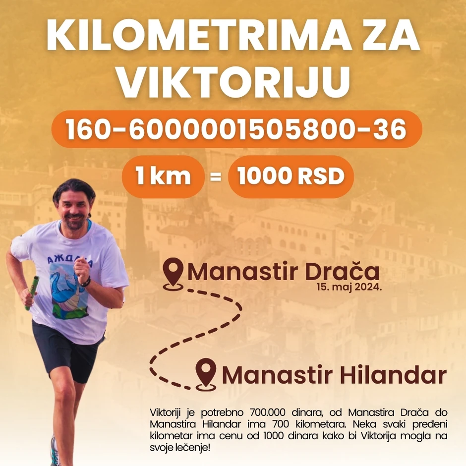 Podsetimo da je Viktoriji potrebno još 700.000 dinara, a da od Manastira Drača do Manastira Hilandar ima 700 kilometara, što znači da će uz pomoć svih dobrih ljudi, donatora i podržavaoca ove akcije Viktorija uspešno prikupiti novac za lečenje.