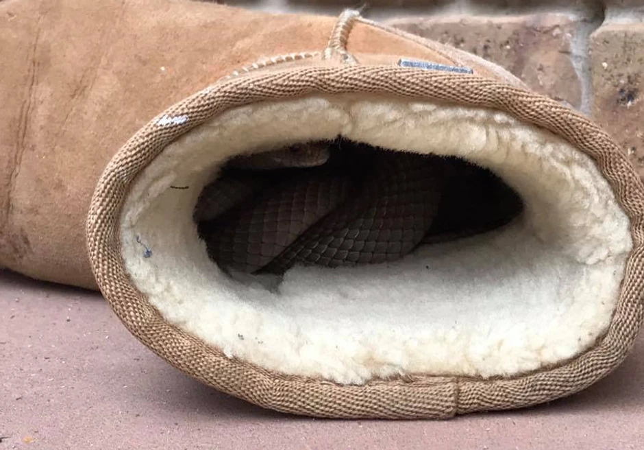 Pre nego što je uzela čizme u ruku, zapazila je braon repić kako nestaje u čizmi. Kada se približila shavatila je da je u njenim popularnim "Ugg" čizmama zmija. Da stvar bude gora, preko metar duga životinja, jedna je od najotrovnijih na svetu.