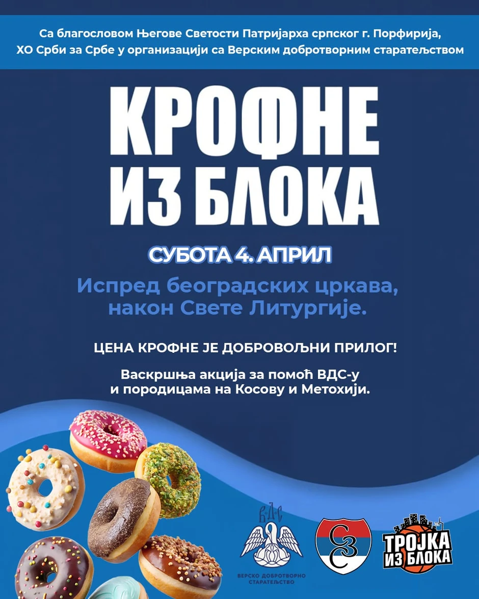 Humanitarna organizacija Srbiju za Srbe, u saradnji sa Verskim dobrotvornim starateljstvom Arhiepiskopije beogradsko-karlovačke, sa blagoslovom Njegove Svetosti Patrijarha srpskog gospodina Porfirija, organizuje u subotu, 4. aprila 2026. godine, na Lazarevu subotu, veliku Vaskršnju humanitarnu akciju pod nazivom "Krofne iz bloka".