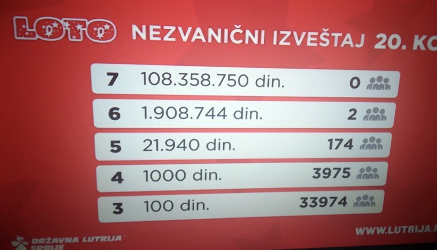 Za loto, čija je suma iznosila 900.000 evra, dobitna kombinacija je glasila: 2, 18, 32, 17, 1, 14, 35. Niko nije imao svih sedam brojeva, ali su dva takmičara dobila po 1.908.744.