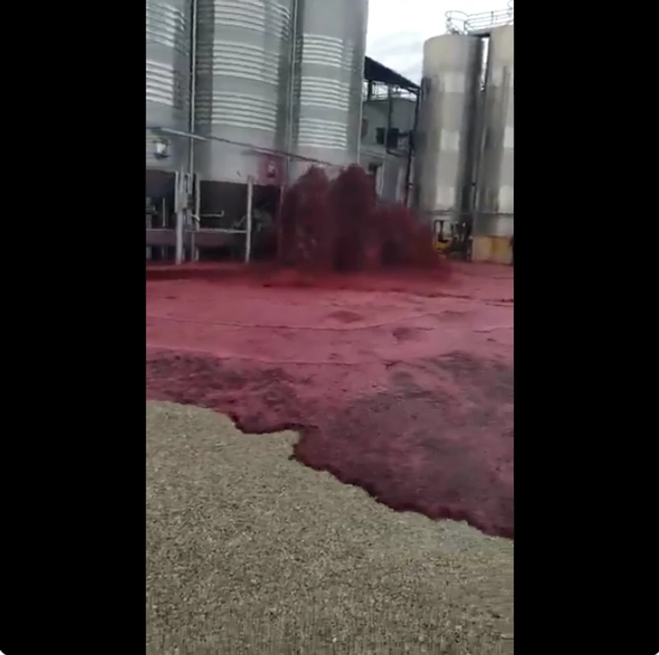 Video-snimak koji se raširio mrežama prikazuje kako iz ogromnog inoks tanka zapremine 50.000 litara, za manje od minuta ističe vino i razliva se po betoniranom tlu fabričkog kruga.