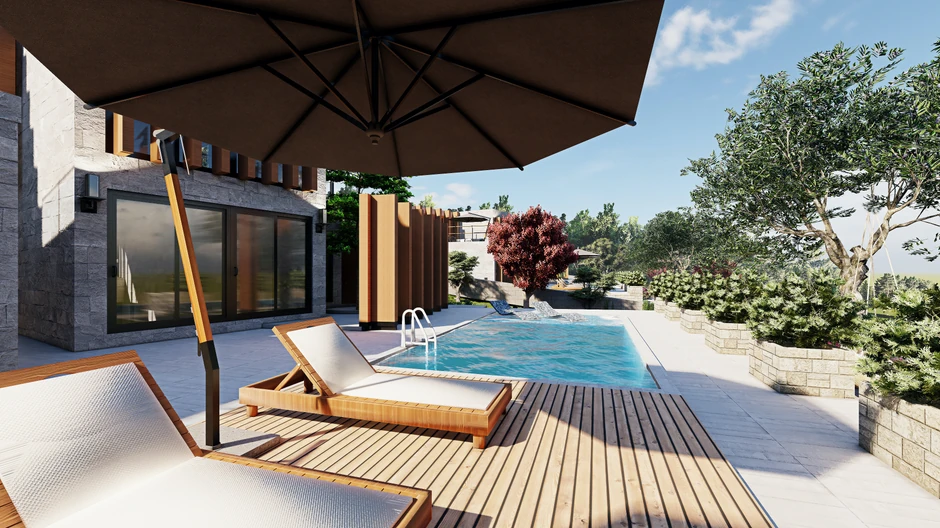 Kao i lokacija, i svi ostali detalji su pažljivo birani. Kompleks čini osam luksuznih vila, planski raspoređenih tako da zapravo čine naselje zatvorenog tipa. Svaka od njih poseduje sopstveni bazen jasnih geometrijskih linija sa pazljivo projektovanim dekingom i dogrevanjem vode po zeljama kupaca.