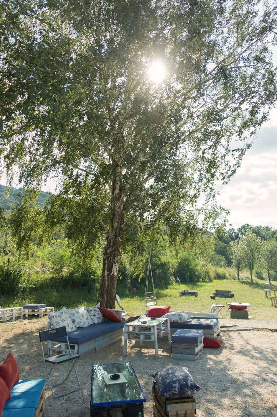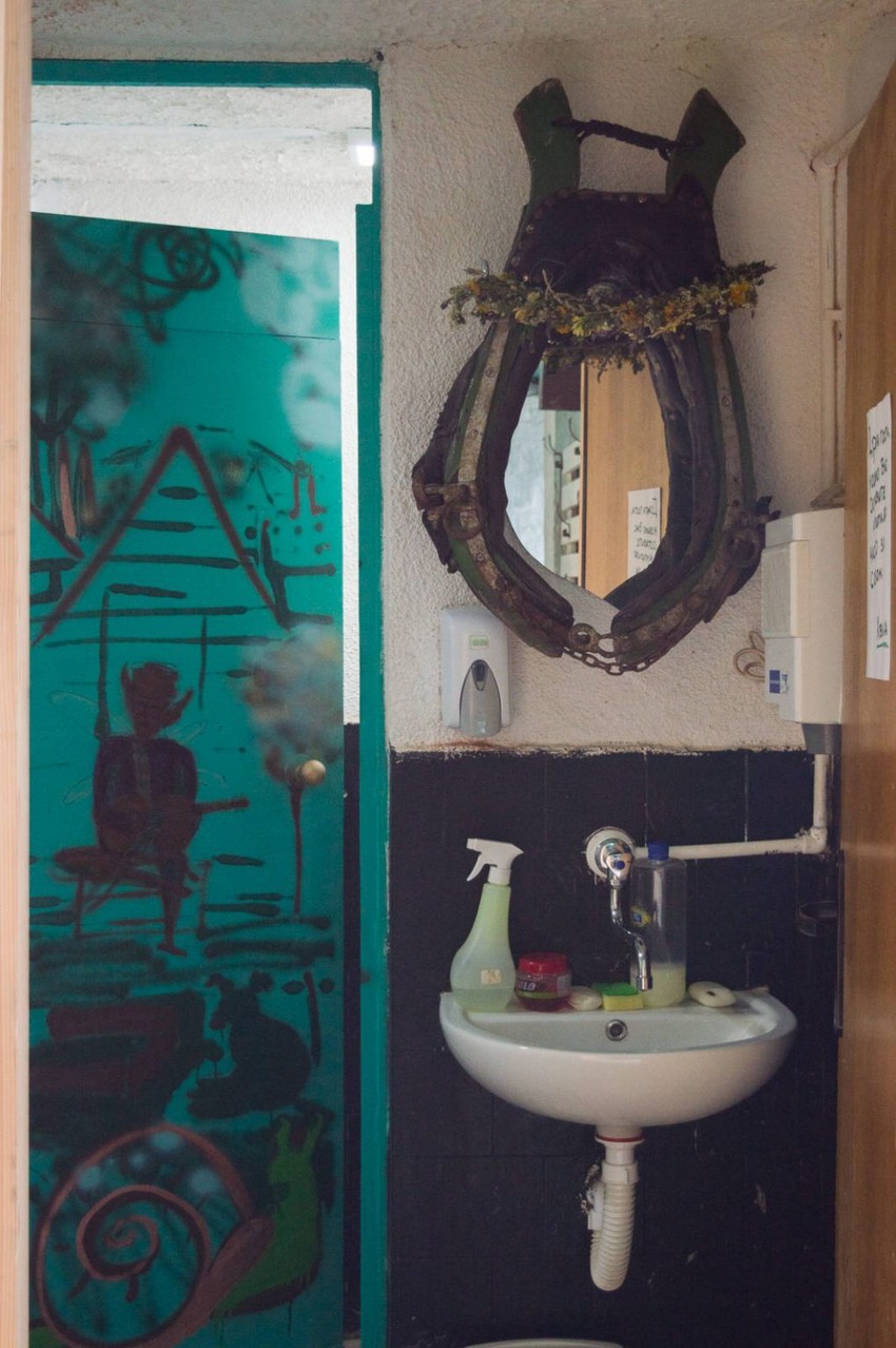 Pre uređene poljane na kojoj se nalaze stolovi i stolice od recikliranih paleta i koturova od kablova nalazi se mini-ranč sa kozama i jarićima o kojima se u poslednje vreme brine Hoze iz Kolumbije. Po ulasku u dvorište kafića sa leve strane su neobičan sto i oslikane ptičice na zidu – mural mladog Halila iz Turske, jednog od ovdašnjih volontera.