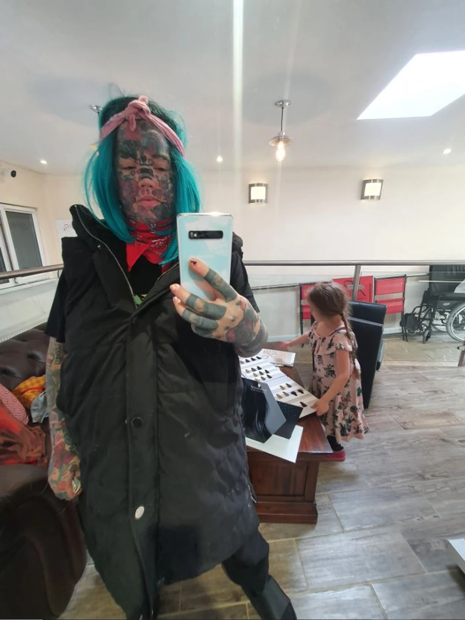 Melisa Sloan (45) iz Velsa je majka sedmoro dece i za njen izgled, koji bi mogao da se okarakteriše kao neobičan, zaslužne su tetovaže, od kojih su mnoge na njenom licu. Lice joj je prekriveno srcima i ružama od tinte, a na obrazu se našlo mesta i za zastavu.