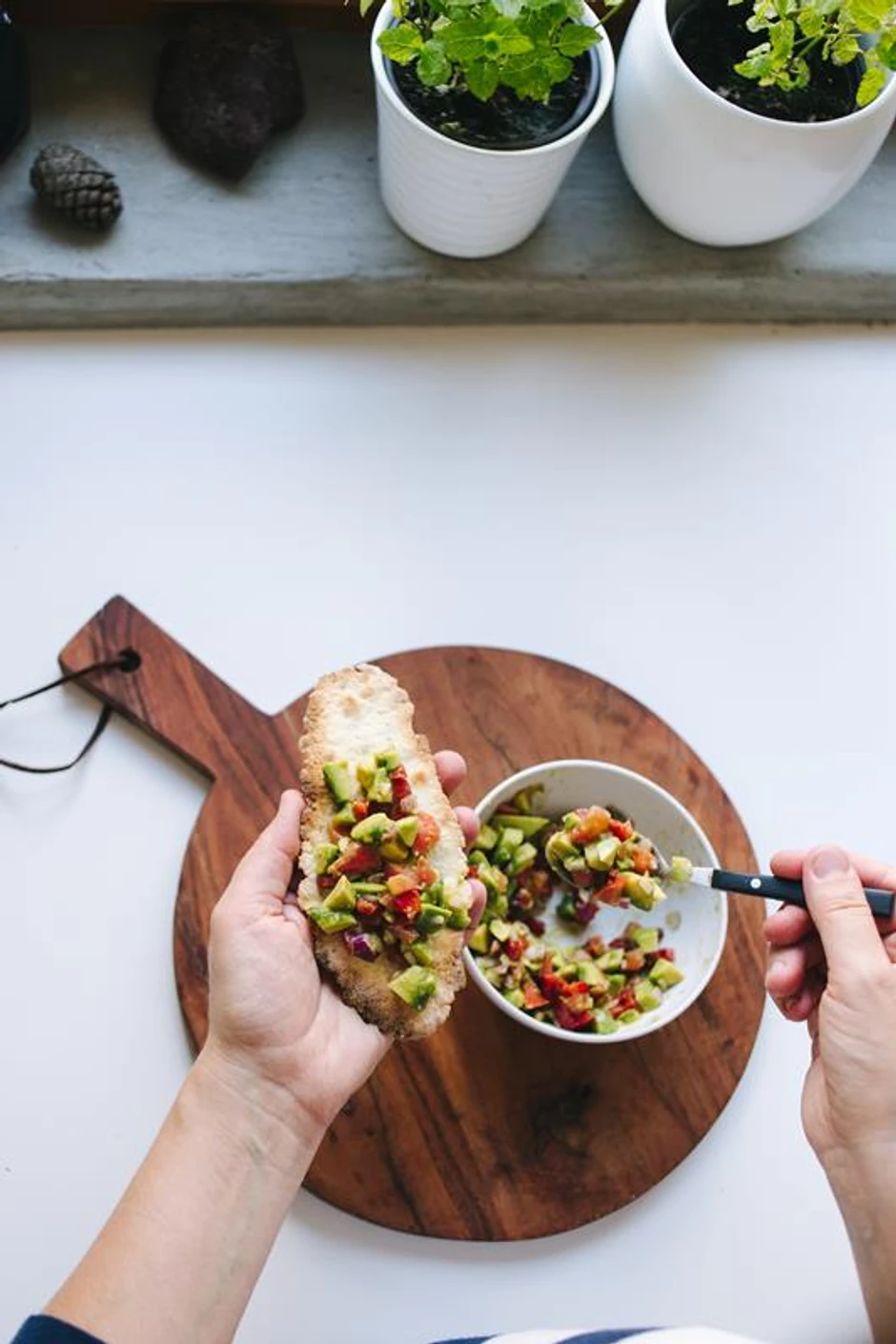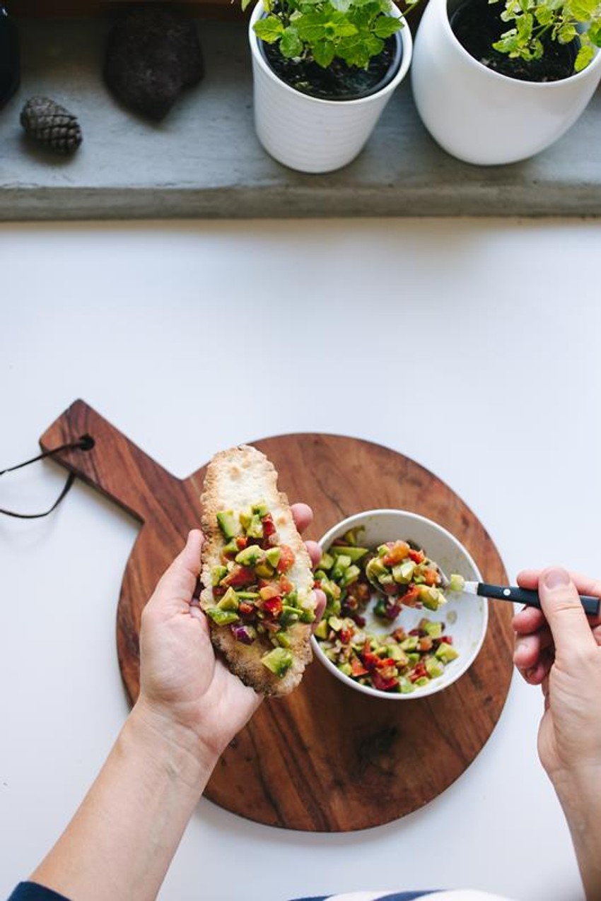 Sastojci: 1 avokado, 1/2 glavice ljubičastog luka, 1 manji paradajz, 1/4 crvene paprika, so