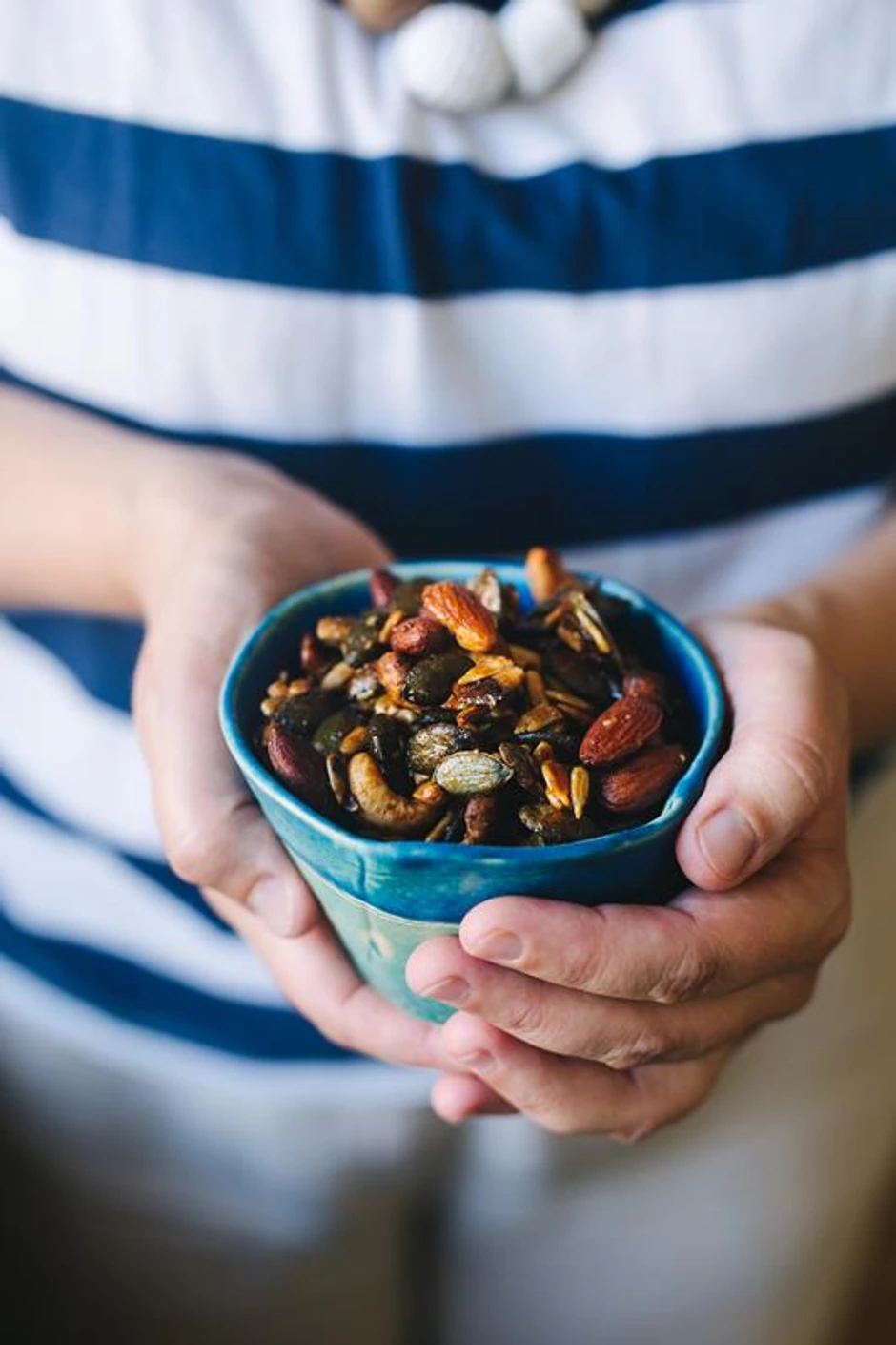 Sastojci: 1 šolja sirovih badema, 1 šolja sirovog indijskog oraha, 1/2 šolja golice, 1/4 šolje semenki suncokreta, ⅓ šolje meda, 2 kašike maslinovog ulja, 1 kašika suvog ili svežeg ruzmarina, 1/2 kašičice ljute dimljene paprike, 1/2 kašičice mlevene paprike, 1/2 kašičice belog luka u prahu, 1 kašičica soli