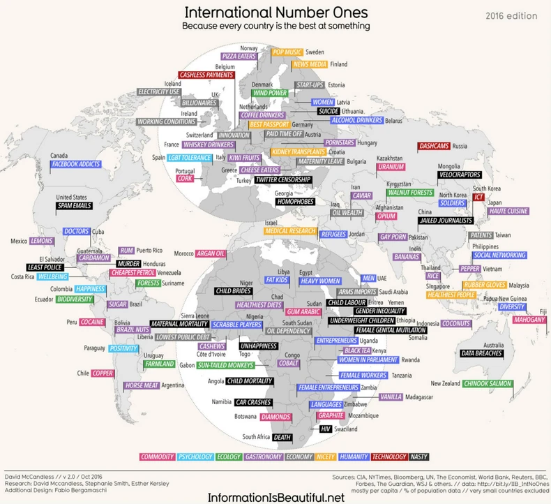 Svaka zemlja je najbolja na svetu u nečemu, moto je po kome su na sajtu www.informationisbeautiful.net sakupili podatke iz brojnih izvora i na taj način napravili mapu sveta.