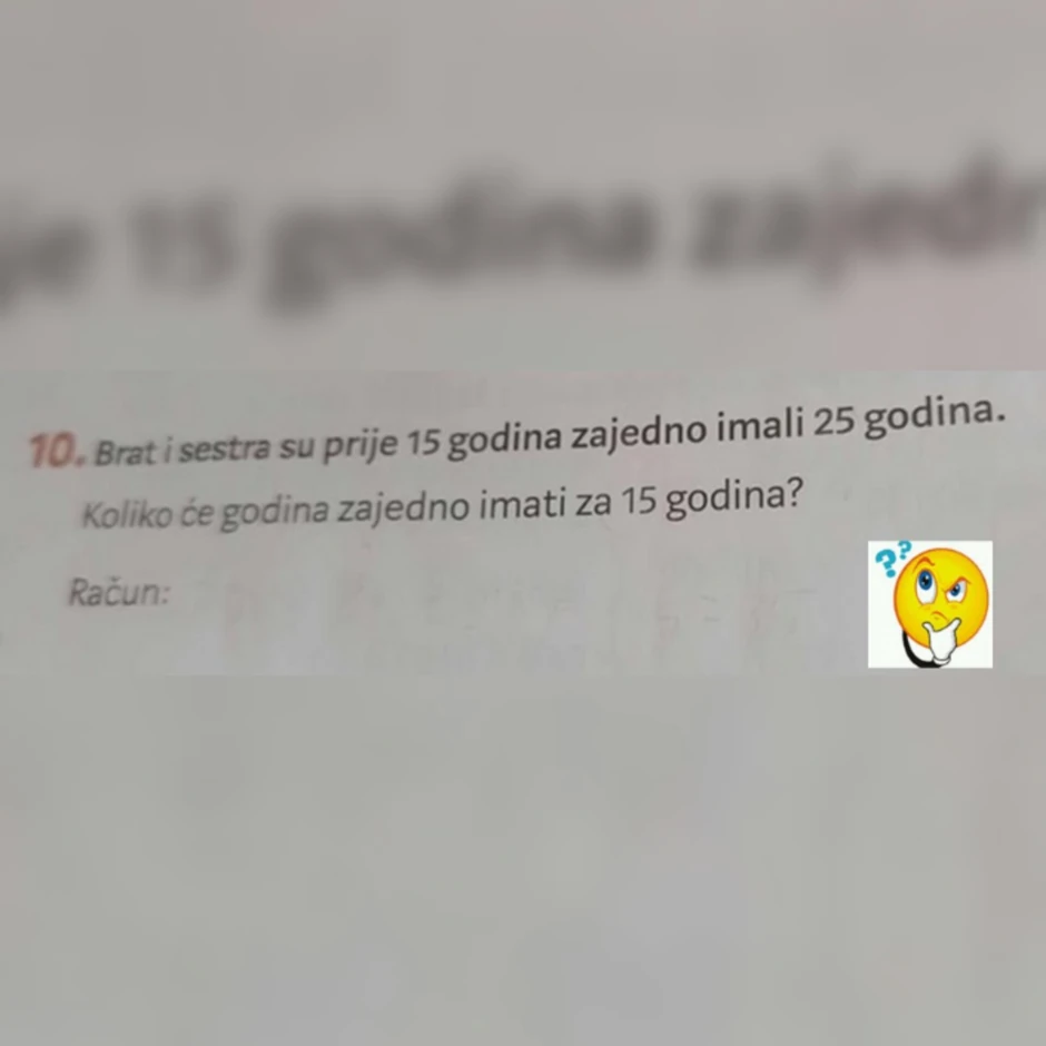 "Brat i sestra su pre 15 godina zajedno imali 25 godina. Koliko će godina zajedno imati za 15 godina?"
