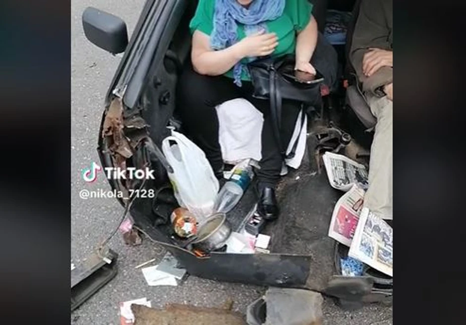 Naime, kako se vidi na snimku, unutar Golfa dvojke, nalazili su se stariji čovek i žena, dok je svuda oko njih stajalo posuđe, plastične flaše, novine i kese. Ono što budi jezu jeste činjenica da je tokom sudara, čitav prednji deo karoserije automobila nestao, kao da ga je neko isekao nožem.