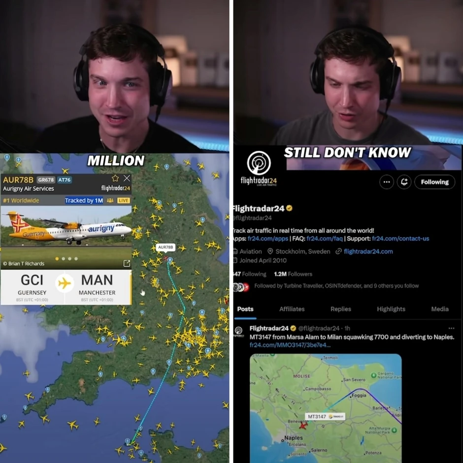 "Nešto veoma zanimljivo se trenutno dešava na FlightRadar. Ako pogledate gornji levi uglu, broj samo raste. Imamo let koji trenutno prati 663.000 ljudi. Zašto je to tako? Nemam apsolutno pojma. FlightRadar nema pojma ni. Oni su tvitovali, 'Ovo je najveći interes ikada za ATR 72, i ne, nemamo pojma zašto,'" rekao je Aaron.