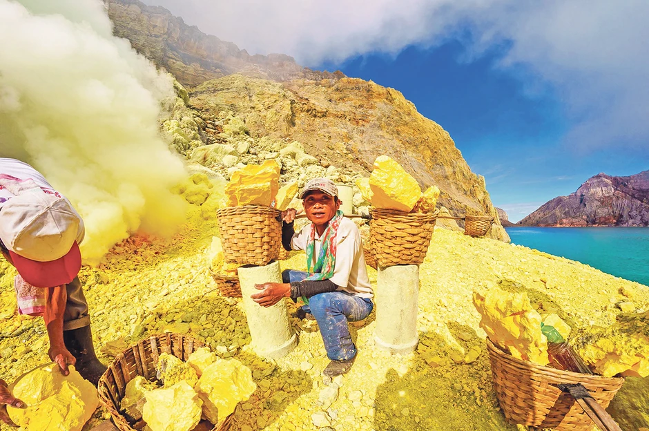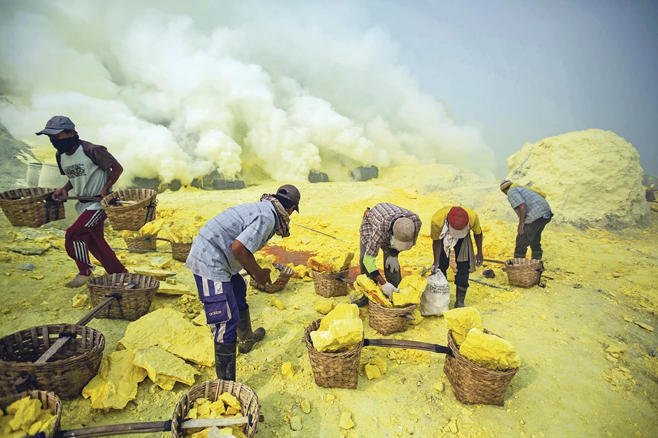 Vulkan Ijen koji se nalazi u istočnom delu Jave u Indoneziji izuzetno je bogat sumporom, a rudari koji ga vade pešače do vrha vulkana na visini od 2.640 metara i kroz krater ulaze u rudnik koji je prepun sumporne kiseline do dubine od 200 metara. Zvuči kao paklen posao. Rudari rade svakodnevno u opasnim uslovima i to za dnevnicu od 13 dolara.