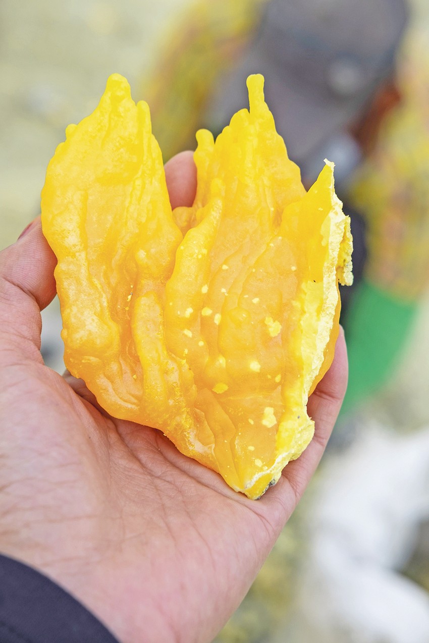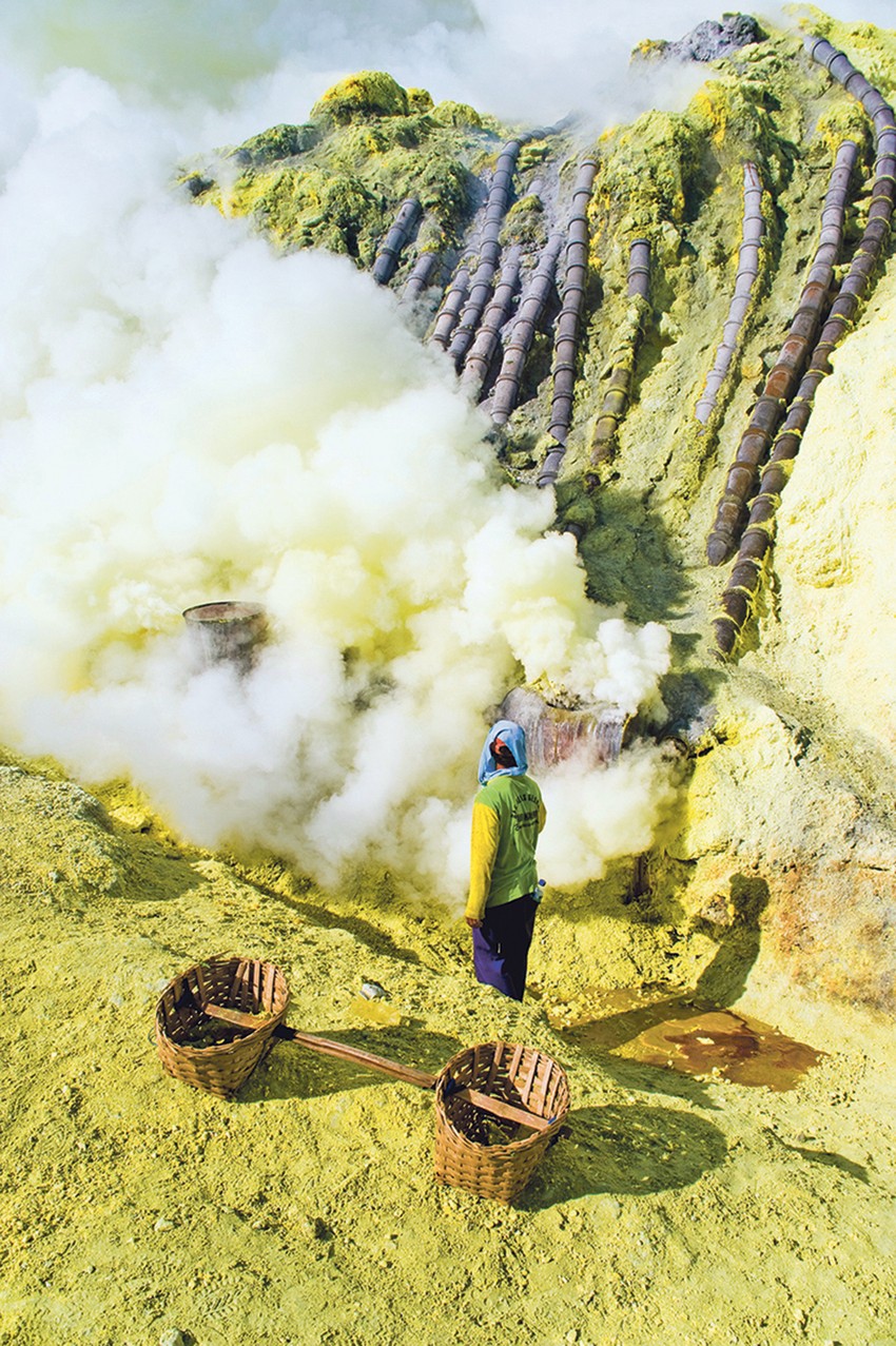 Nakon što se sumpor ohladi i pretvori u svoju prepoznatljivu žućkastu boju, rudari ga otkidaju sa zidova kratera. Izvanredne fotografije pokazuju težinu ovog posla, a istovremeno dokumentuju prirodni krajolik vulkana kojem se mnogi dive.