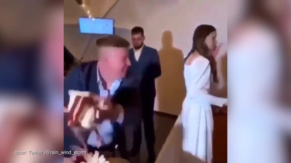 Pijani gost za koga se navodi da je bio kum na ovom venčanju, u jedenom trenutku je počeo da gađa tortom mladence, kojima se to nije dopalo, ali su tolerisali napadnog muškarca sve do trenutka kada je mladoženji "pukao film" te je jednim udarcem oborio vidno alkoholisanog kuma.