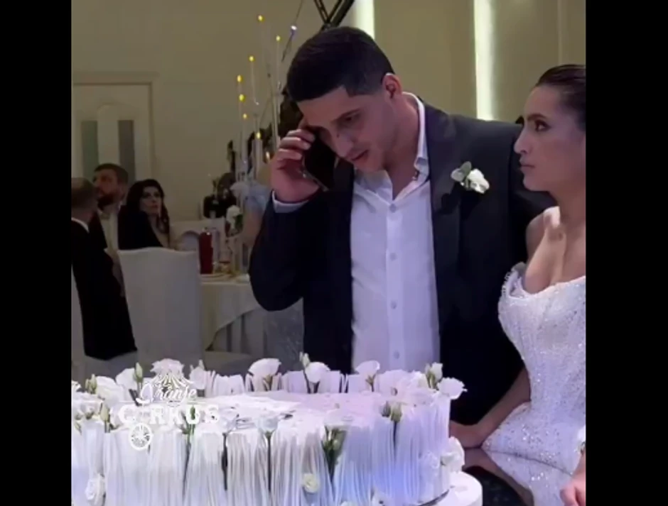 Kako se na njemu vidi - u trenutku kada su sve oči bile uprte u mladence i kada je trebalo da seku torte, svečani trenutak je neočekivano prekinuo telefonski poziv. Mladoženja je javio i započeo razgovor, potpuno nesvestan situaije koja je nastala oko njega.