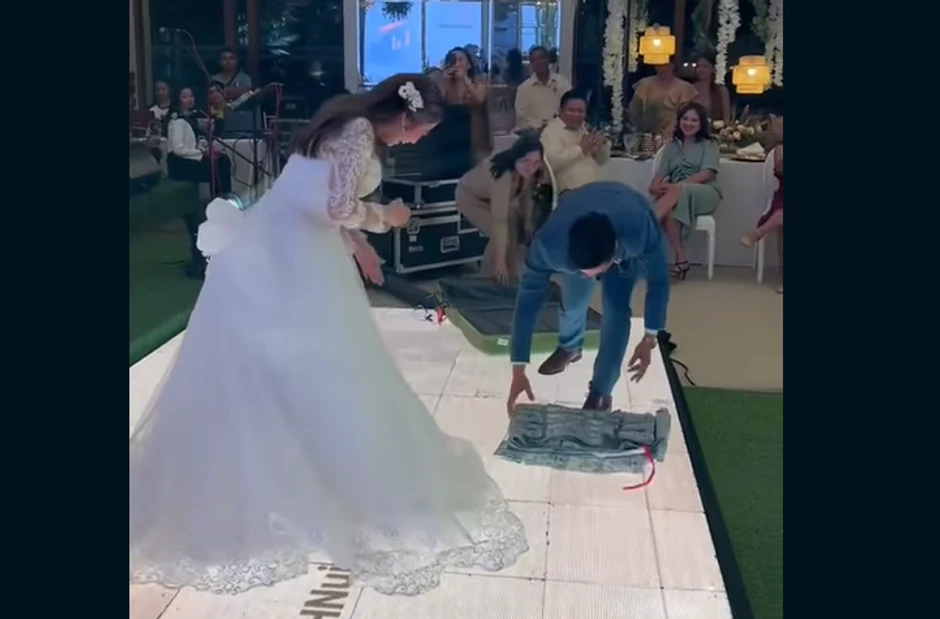 Kako se može videti na snimku, mladoženja je na samom vrhuncu zabave, na podijum do svoje mlade došao sa punim koferom. Dok su gosti zbunjeno gledali i iščekivali trenutak istine, mlada je izgleda prva shvatila o čemu se radi, te počela da tapše od sreće.