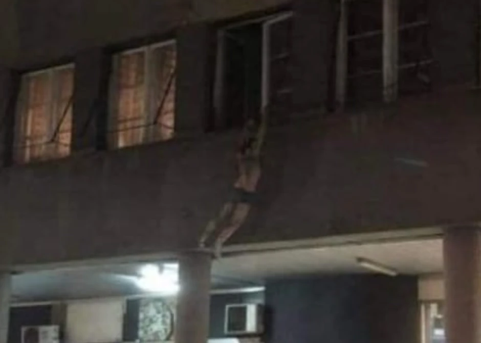 Tokom večeri su se na društvenim mrežama pojavile fotografije ovog muškarca kako visi sa prozora jedne višespratnice u Krađorđevoj ulici u Smederevu.