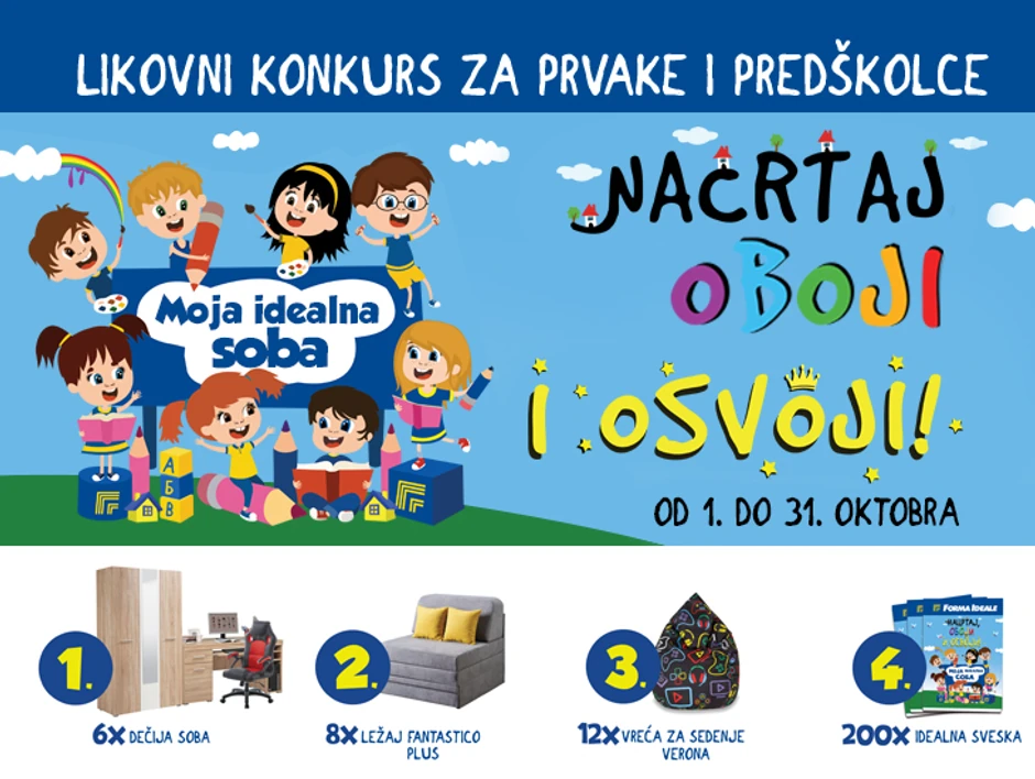 Kompanija Forma Ideale i ove godine donosi posebnu radost mališanima i daje im priliku da se kreativno izraze učešćem na četrnaestom po redu dečijem likovnom konkursu pod nazivom „NACRTAJ, OBOJI, OSVOJI“. Konkurs će trajati od 1. do 31. oktobra 2025. godine, a namenjen je prvacima i predškolcima iz cele Srbije.