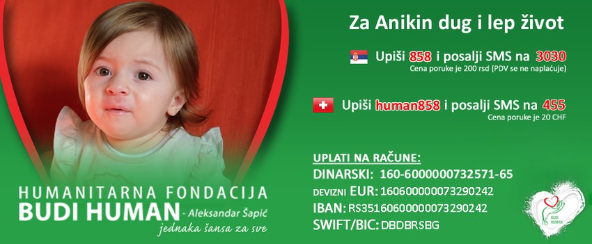 - Mi smo već u kontaktu sa bolnicom koja čeka na Aniku da dobije Zolgensmu i jedino što se čeka je da se što pre sakupi novac. I tu nas je sačekao šok. Kao da nije dovoljno da ti dete bude smrtno bolesno, pa da saznaš da postoji genska terapija koja može da je spase, onda se ispostavi da je baš taj lek zvanično najskuplji lek na svetu! Neverovatnih 2,1 miliona evra je sada izazov koji je pred nama. A onda smo videli da nada postoji, da je moguće skupiti sredstva i u Srbiji i u mnogim drugim zemljama i to nam je dalo snagu. Mi smo sve drugo probali i vidimo prikupljanje sredstava preko fondacije „Budi human“ kao poslednju šansu za našu Aniku da poživi dug i lep život. Iako suma deluje nedostižna, u jednoj evropskoj zemlji su uspeli da skupe novac za 3 dana, tako što se 950.000 stanovnika odazvalo i poslalo po jedan SMS. Bili smo u čudu kada smo to čuli. Zaista je tako - vaše malo je nama ceo svet - dodaje majka.