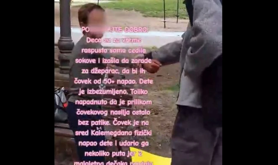 "Deca su za vreme raspusta samo cedila sokove i izašla da zarade za džeparac, da bi ih čovek 50+ godina napao. Dete je izbezumljeno i toliko napadnuto da je prilikom čovekovog nasilja ostao bez patike... Čovek je nasred Kalemegdana fizički napao dete i udario ga nekoliko puta jer dva maloletna dečaka prodaju sokove i time prave konkurenciju njemu koji ima štand. Zavodi red i kaže kako je Kalemegdan njegov. Većina ljudi je samo gledala. Pazite svoju decu!", objasnila je u video snimku devojka koja je celu situaciju i snimala.