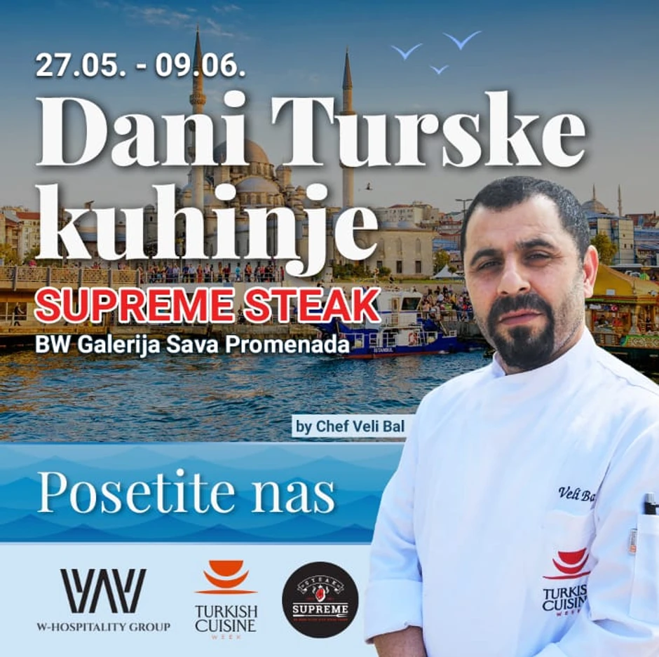 Restoran „Steak Supreme” će narednih dana, od 27. maja do 9. juna, biti domaćin turskim gastro majstorima, koji za goste restorana pripremaju probrane specijalitete iz njihove bogate kulinarske tradicije. Manifestacija se organizuje na inicijativu Ambasade Republike Turske u Beogradu i održava se već tri godine zaredom. Ove godine, izabrali su da se upravo u meni ovog restorana uvrste neka od najkvalitetnijih jela koja spajaju Istok i Zapad, odnosno Aziju i Evropu, sa naglaskom na izmirske specijalitete. Pored Beograda, u ovu globalnu akciju promocije turske gastronomske ponude uključeni su brojni gradovi širom sveta.