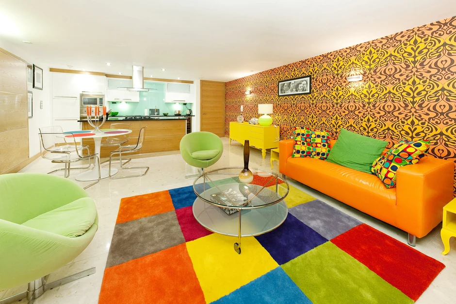 Izraz retro stila je veseo, oblici i motivi su geometrijski, materijali sintetički... Boje su obično svetle i jarkih tonova kao što su senf žuta, tirkizna, pink, crvena, narandžasta, zelena i braon. Dezeni sa geometrijskim oblicima i šarama se javljaju na tapetama, posteljini, zavesama pa i foteljama i garniturama za sedenje. Oblici nameštaja su zaobljeni, nameštaj je funkcionalan, jednostavan i udoban. Nameštaj nije skup i akcenat je na estetici više nego na kvalitetu. On je pre svega spoj lepog i korisnog. Koloritno zasićen i smeo retro dizajn je na granici kiča.
