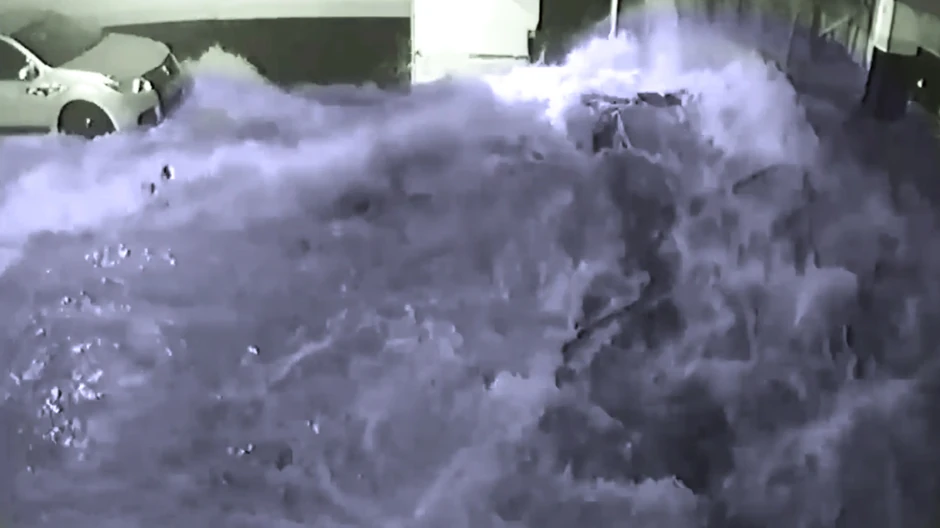Naime, sva voda iz bazena koji se nalazio u blizini tog parkinga se izlila i poplavila ceo sprat. Na snimcima se vidi kako neverovatnom brzinom nestaje voda iz bazena, a na drugom kako se velikom silom razara vrata i poplavlja parking.