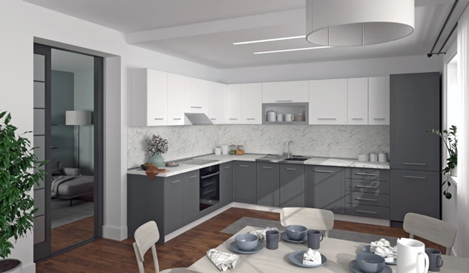 Visoki saten lak sjaj Sistema kuhinjskih elemenata NEVA, idealan je za one koji imaju visoke standarde po pitanju estetike, ali više vole klasičnu eleganciju. Kuhinje UNA dolaze u dekoru bele i sive lak folije, moderne su, elegantne i predstavljaju pravi izbor za ljubitelje visokog sjaja.