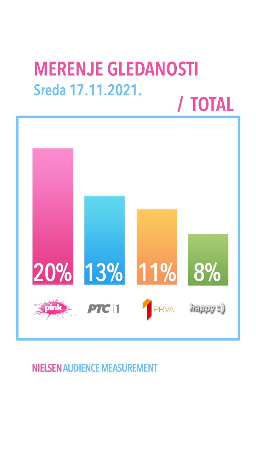 Zvanični podaci agencije za merenje TV gledanosti „Nielsen Audience Measurement“ govore da je TV Pink tokom prethodnog dana bila daleko ispred bilo koje komercijalne TV stanice, ali i gledanija od Javnog servisa Srbije.
