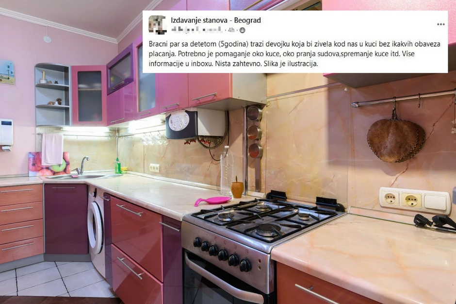 "Bračni par sa detetom traži devojku koja bi živela kod nas u kući bez ikakvih obaveza plaćanja. Potrebno je pomaganje oko kuće, oko pranja sudova, spremanje kuće itd. Ništa zahtevno", piše u oglasu uz fotografiju kuhinje koja je ilustracija, ali ne odudara od realnosti devojke koja prihvati ovu prilično konfuznu ponudu.