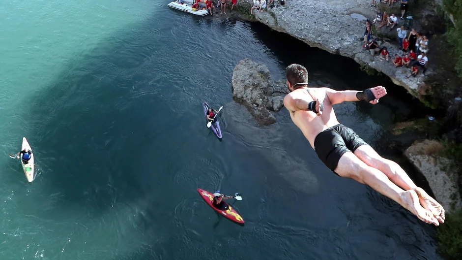 Stari most visok je 22 metra, a kad na takmičenjima postave dodatnu skakaonicu, onda ti momci zure u kotrljajuću reku s 29 metara visine. I bacaju se. Kao ptice.