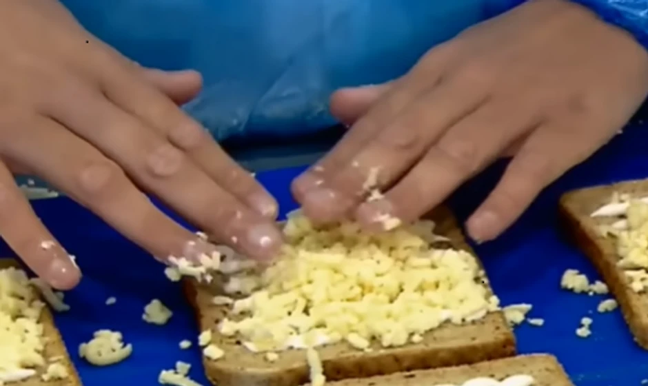 Kako se navodi u videu, određene sastojke i dalje ručno dodaju radnici, poput tanko sečene šunke ili rendanog čedara. Šunka se prethodno ubacuje u mašinu za sečenje, a zatim radnici pažljivo ređaju kriške mesa na hleb. Na kraju, sendviči se ručno zatvaraju i slažu u parove, spremni za dalje pakovanje.