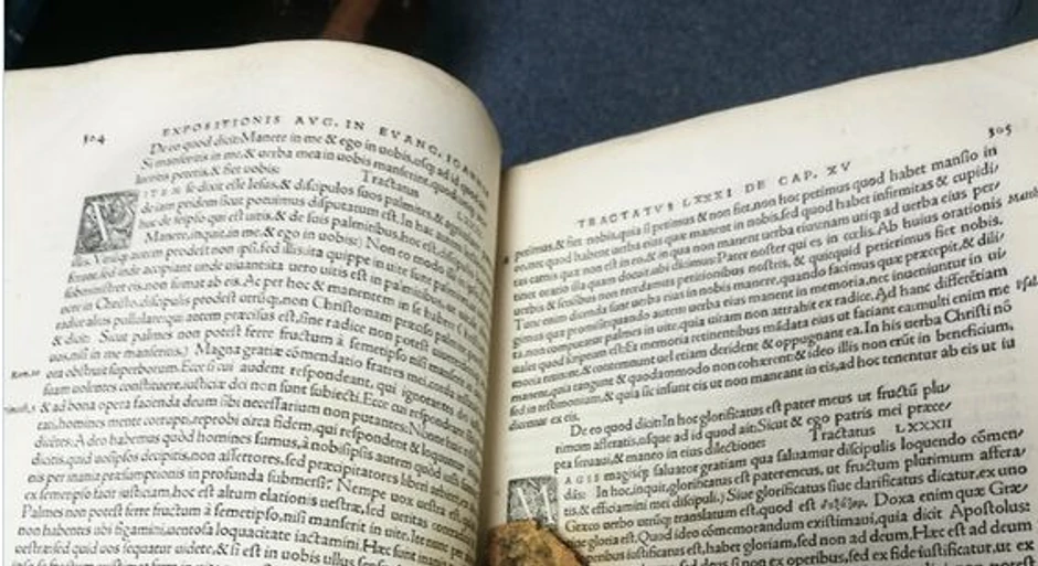 Tokom prelistavanja sabranih dela Svetog Avgustina, u rukopisu koji potiče iz doba renesanse, Emili Duriš je pronašla spljoštenu, isušenu, delimično pojedenu grickalicu, verovatno kolač ili voćnu pogačicu.