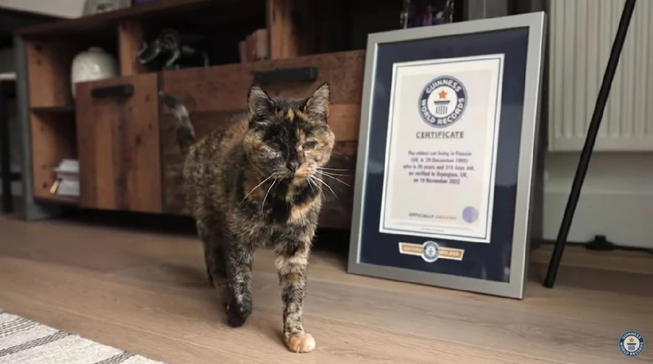 Britanska braon-crna mačka dobila je zvanično priznanje od Ginisove knjige rekorda u četvrtak i iako ima 26 godina i 329 dana, uprkos tome što je slabovida i gluva, Flosi je dobrog zdravlja.