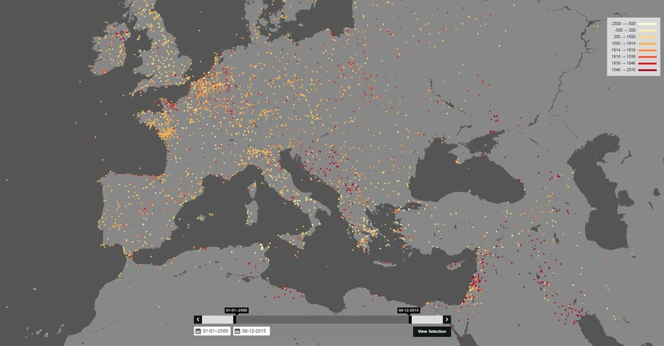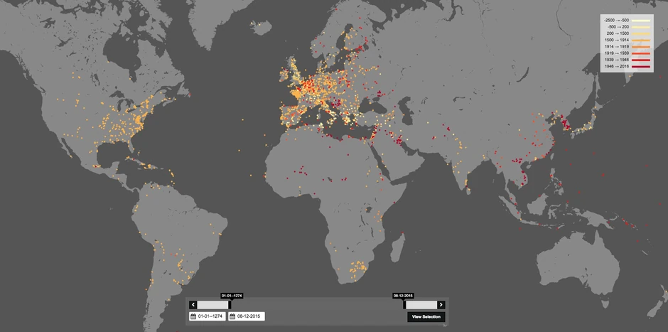 Na mapi se može videti znatan uticaj Prvog i Drugog svetskog rata na povećanje gustine tačaka tokom prve polovine 20. veka.