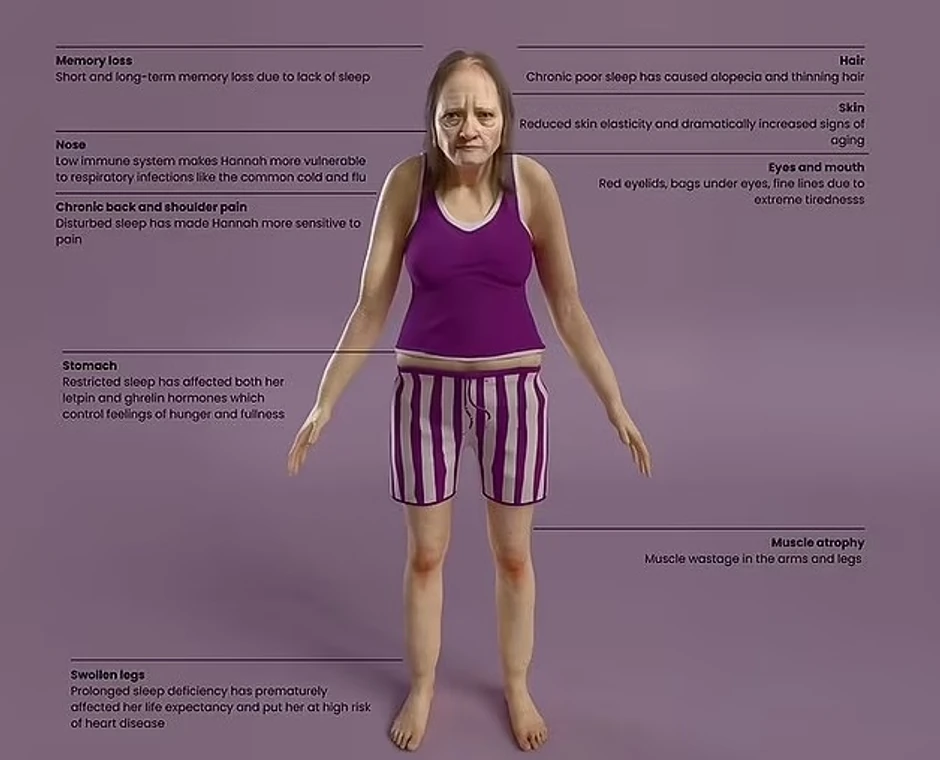 Groteskni digitalni model pokazuje kako bi ljudi mogli da izgledaju 2050. godine ako ne počnemo da spavamo dovoljno. Hana, kako je nazvana ova simulacija, je prosečna žena stara 45 godina iz budućnosti - pati od hroničnih bolova u leđima, proredele kose, opuštene kože, otečenih nogu i crvenih, natečenih očiju.